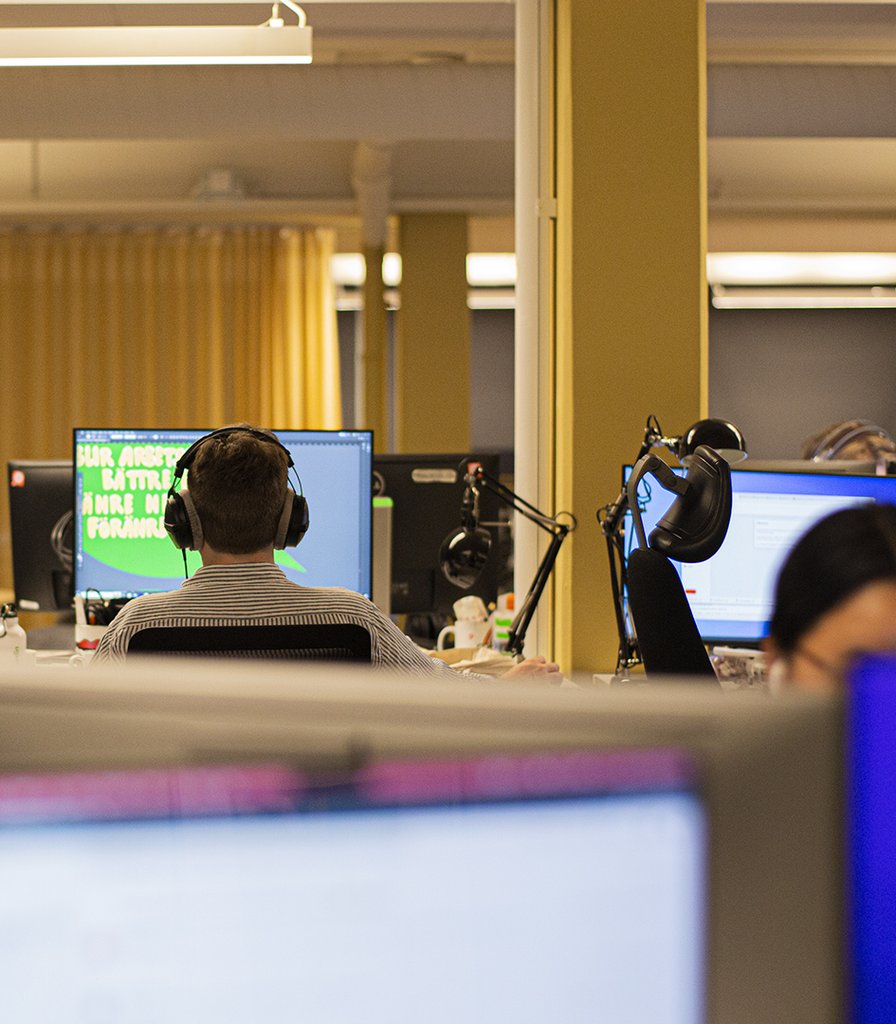 När du behöver lite lugn och ro, kika uppåt. På våning två finns både öppna ytor och stängda rum. Här finns en massa små rum för telefon- eller videomöten med höj- och sänkbara bord, några mellanstora för en-till-en-snack, ett gäng större mötesrum med proffsig skärm och videomötesutrustning, en helt egen poddstudio och ett relax-rum där vi kan vila, meditera eller kanske få en massage. Däruppe hittar du även skrivarrum, förråd och ett par videoredigeringsstudios.